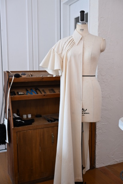そんな想いが強く乗っているのが、上画像のシャツドレス。想いだけをのせ、ただただ笑顔と喜びの為だけに!とデザイン画を描かず、最終の着地点も設定せず、手だけを動かして形にしたものです。