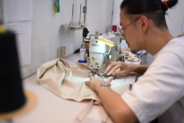 大阪市の北部、住宅地の路地にある小さなアトリエで、自身のブランドMASAHIRO OKUNOのモノづくりをする奥野さん。デザインから縫製まで個人のクリエイティビティで作り上げるブランドです。