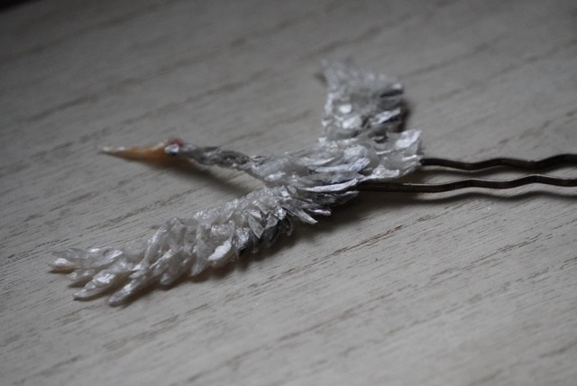 制作工程で出る貝殻のカケラを生かした、「貝殻の鶴かんざし」です。