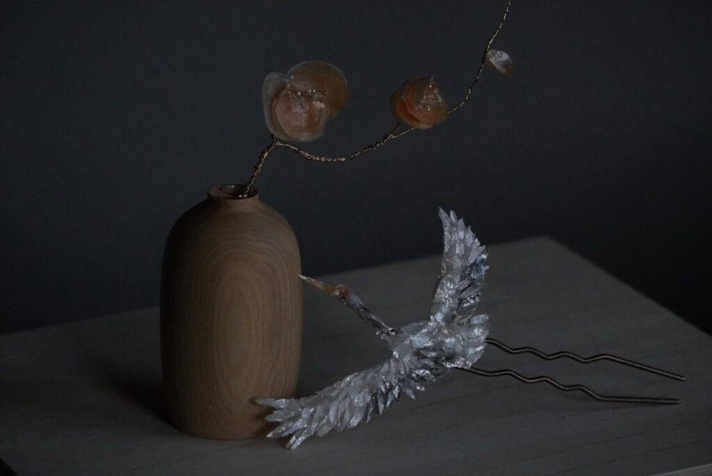 制作工程で出る貝殻のカケラが鳥の羽に類似していたことから、ヒントを得て誕生したのが “鶴のかんざし” 。