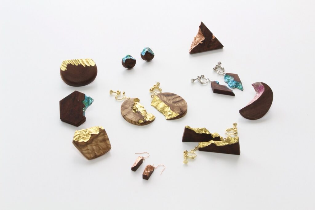 使用の難しい木の端材、その欠けた部分に金属とガラスの独自技法を施すことでアクセサリーに。
